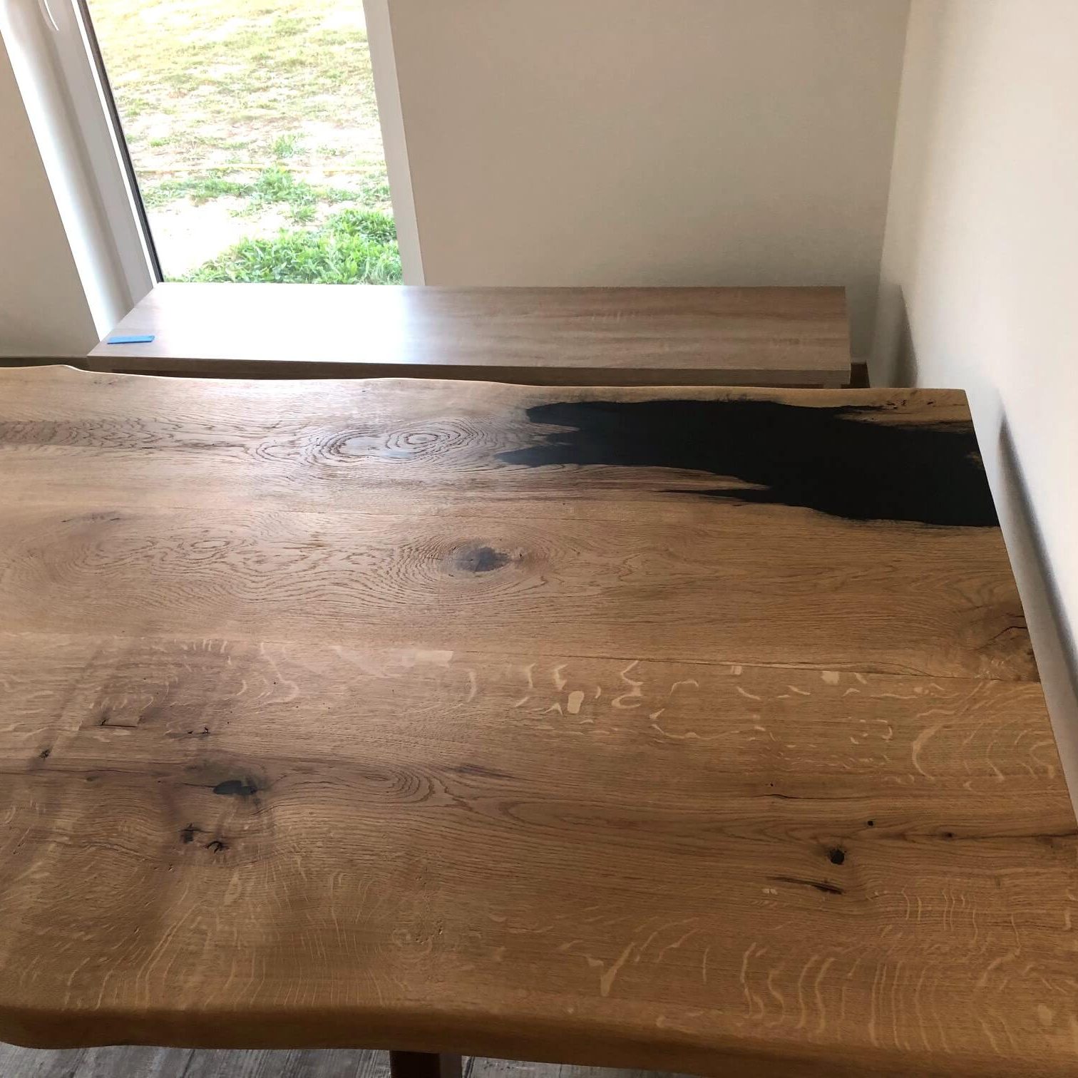 Kleine Risse und Löcher wurden mit transparentem Epoxydharz ausgegossen. Seitlich an einer Stelle wurde das verwitterte Holz entfernt und der Bereich mit schwarzem Epoxydharz aufgefüllt.