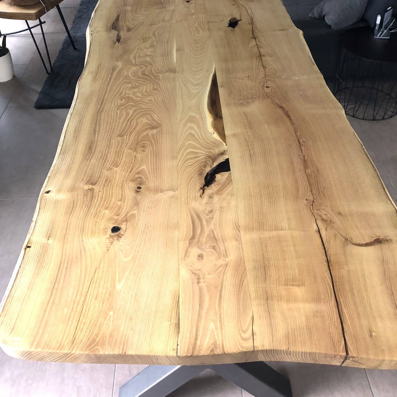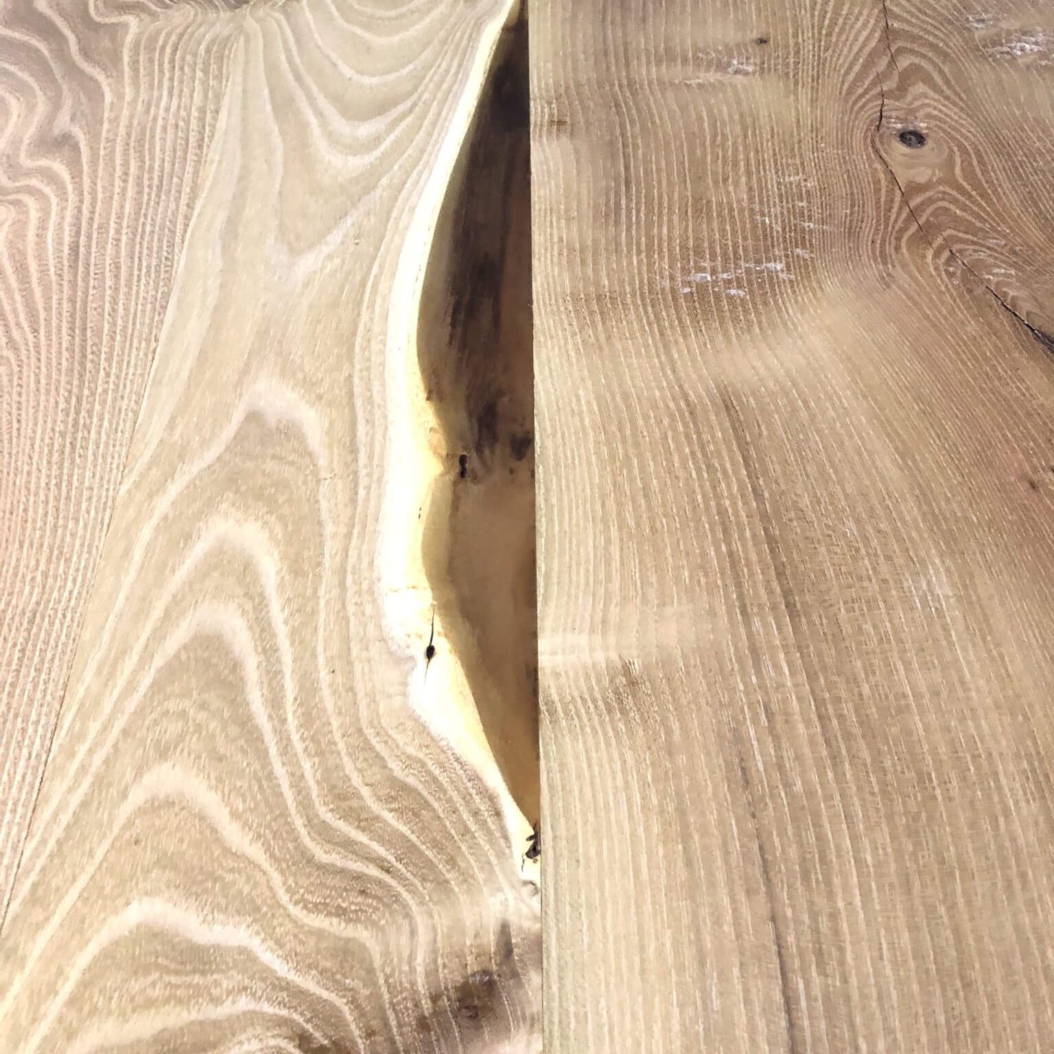 Schöne Maserung, leicht geschwungene Baumkante sind charakteristisch für diesen Tisch.