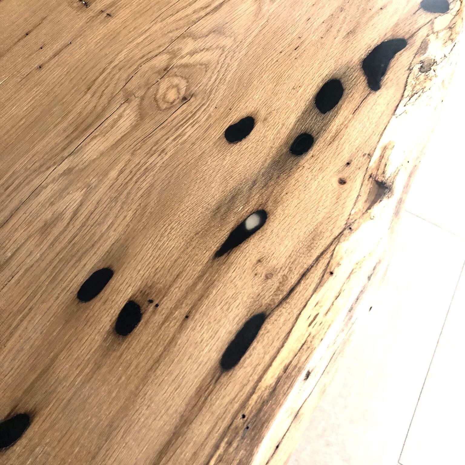 Die vielen Löcher die diese Tischplatte durchziehen wurden ebenfalls mit transparenten