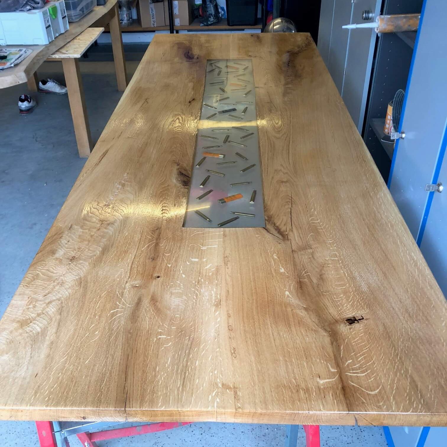 Ein Jägertisch mit sehr schöner Masserung aus Eiche indem mittig leere Patronen mit Epoxydharz vergossen wurden.