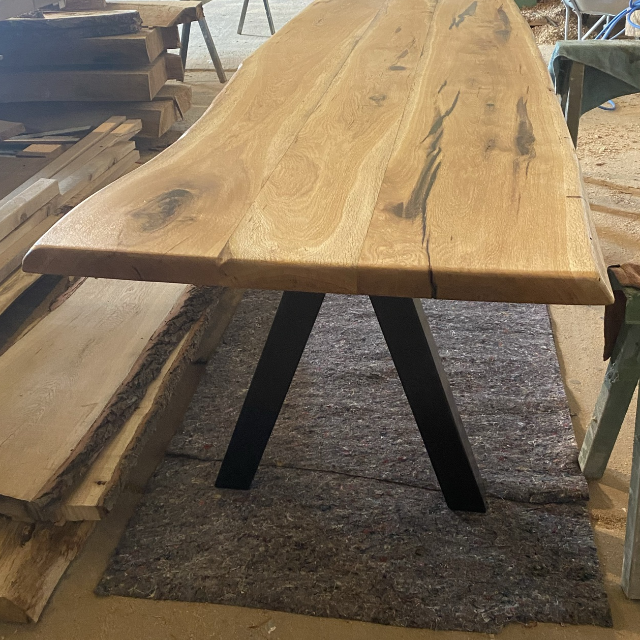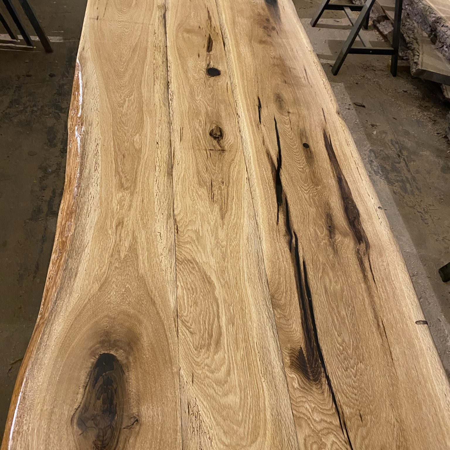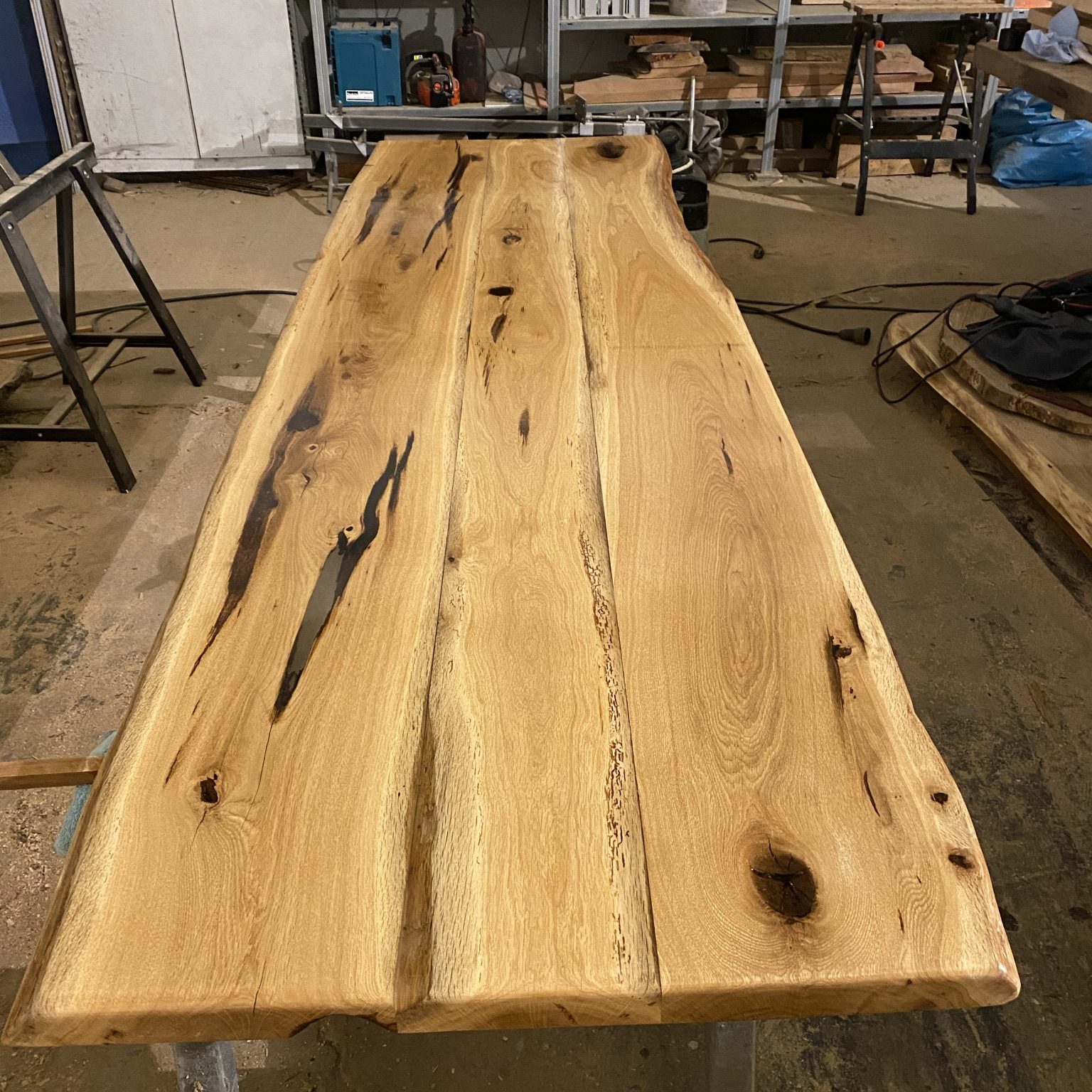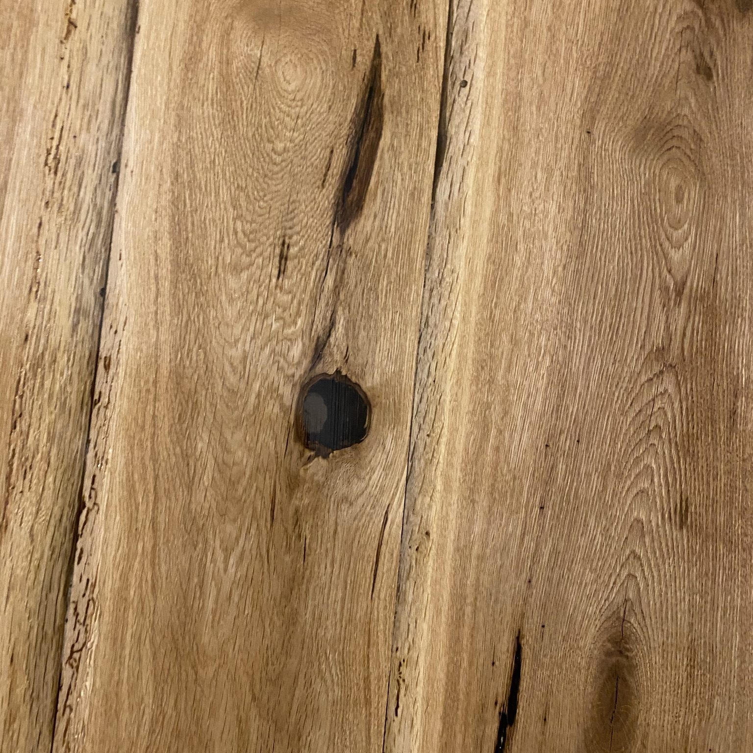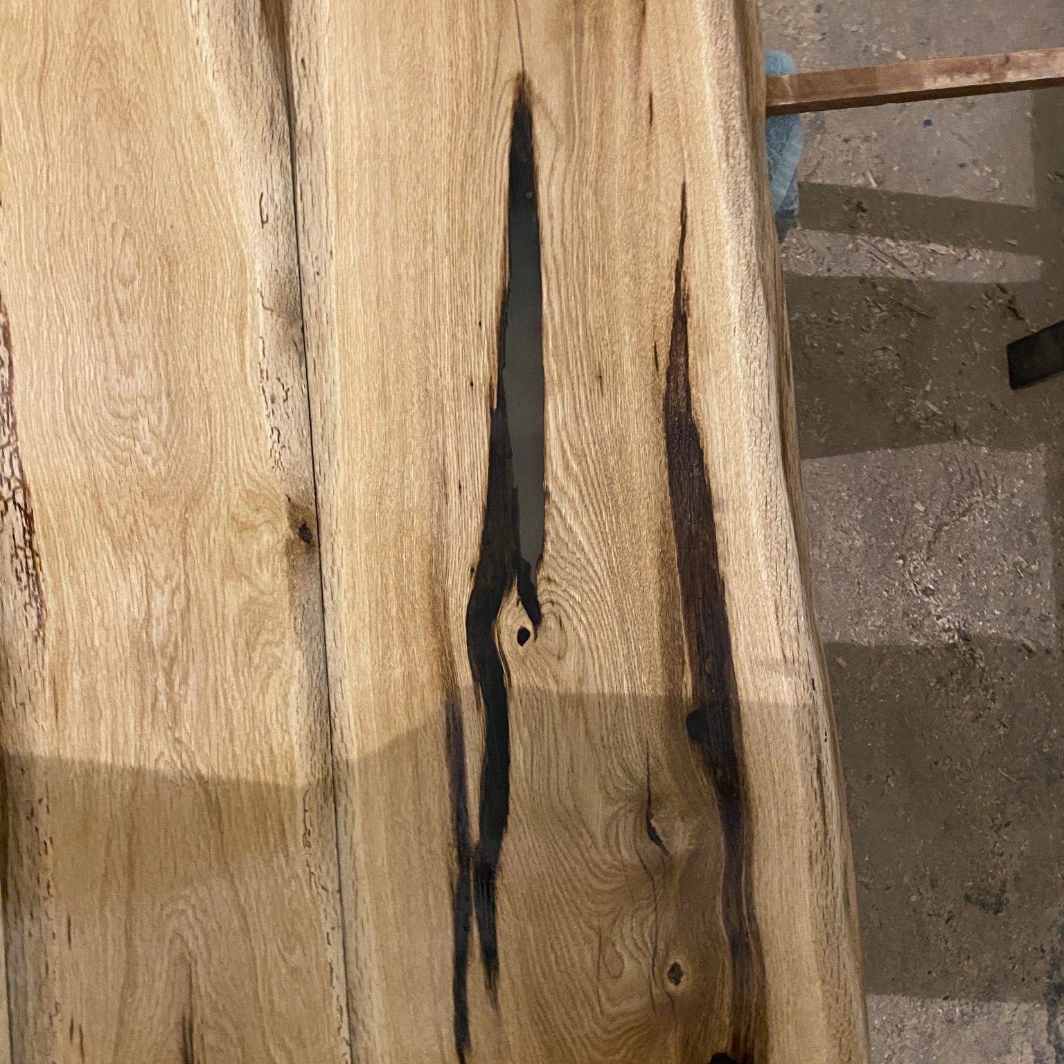 Die Eichbohlen hatten einige verwitterte Stellen. Das Holz wurde hier entfernt und die Stellen mit Epoxydharz vergossen. Das man durch diese Stellen bis auf den Boden schauen kann macht diesen Tisch so einzigartig.