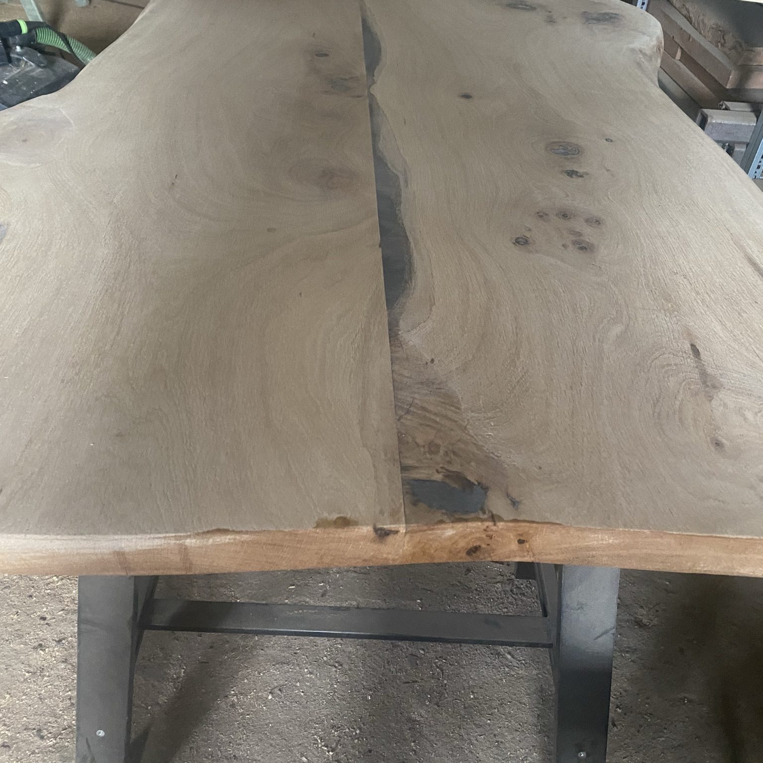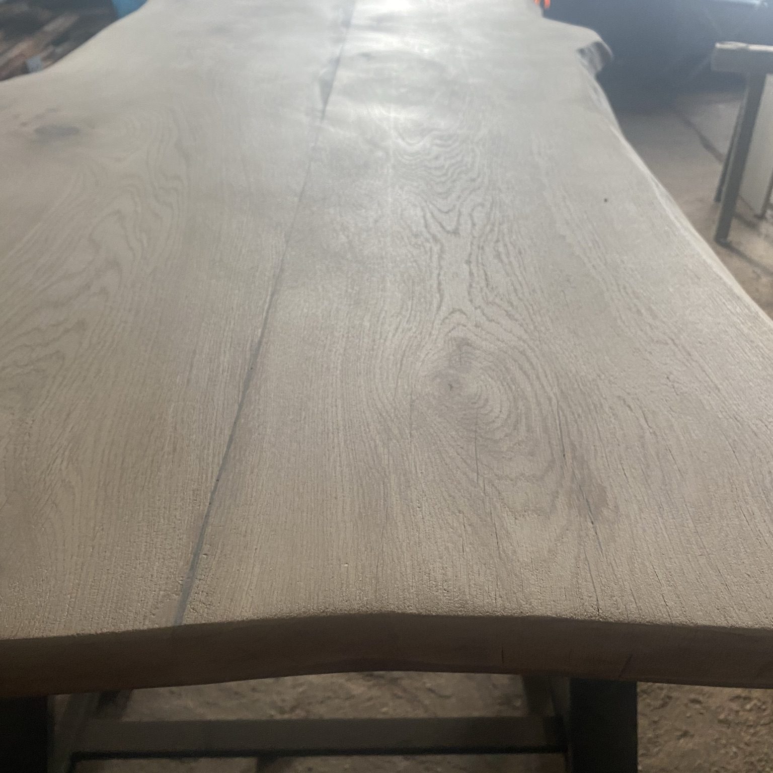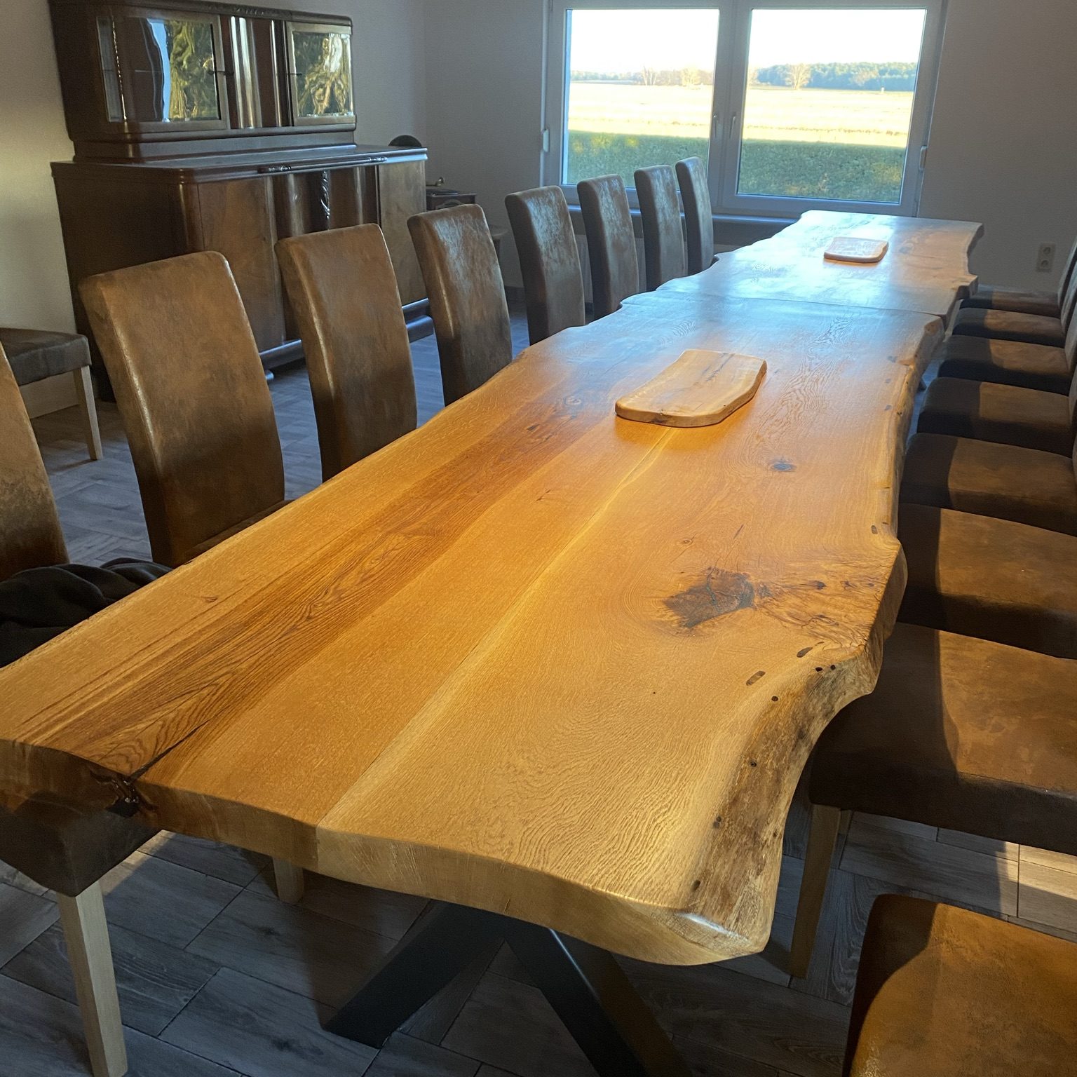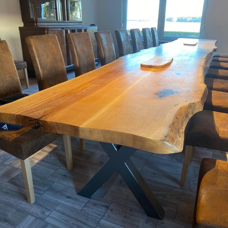 Jeder Eichentisch besteht aus 2 Bohlen mit sehr schön ausgebildeter Baumkante. Damit die Tische optimal zu einer Tafel zusammengestellt werden können wurden die Kanten passend zueinander geschnitten.