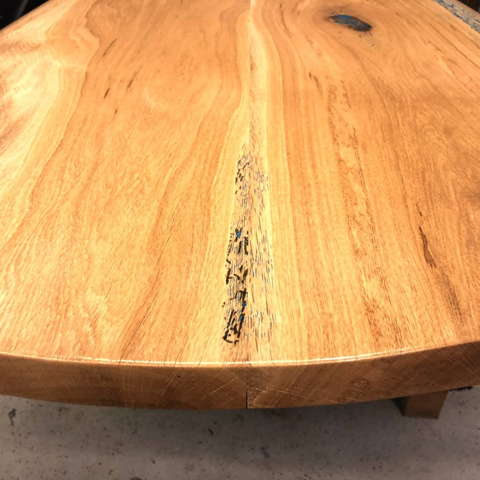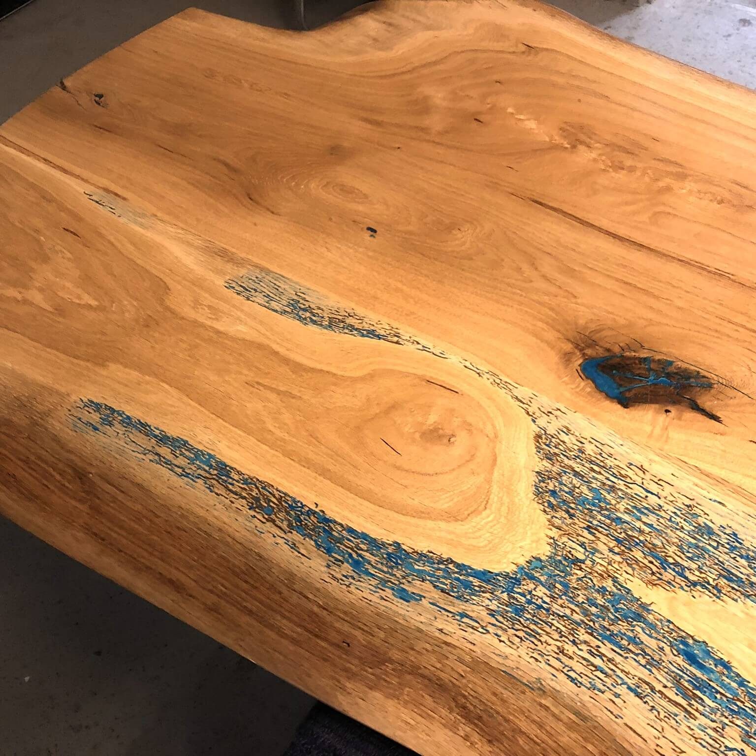 Die Wurmlöcher und Äste wurden mit blauen Epoxydharz (ocean blue) verschlossen.