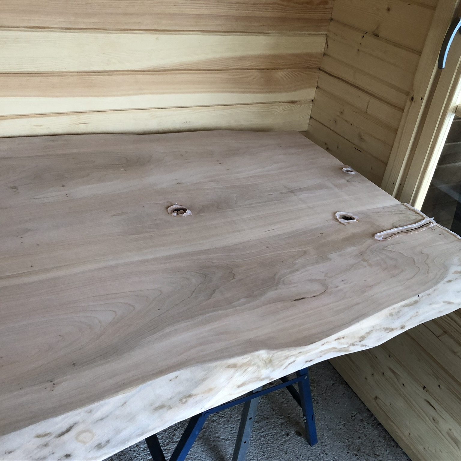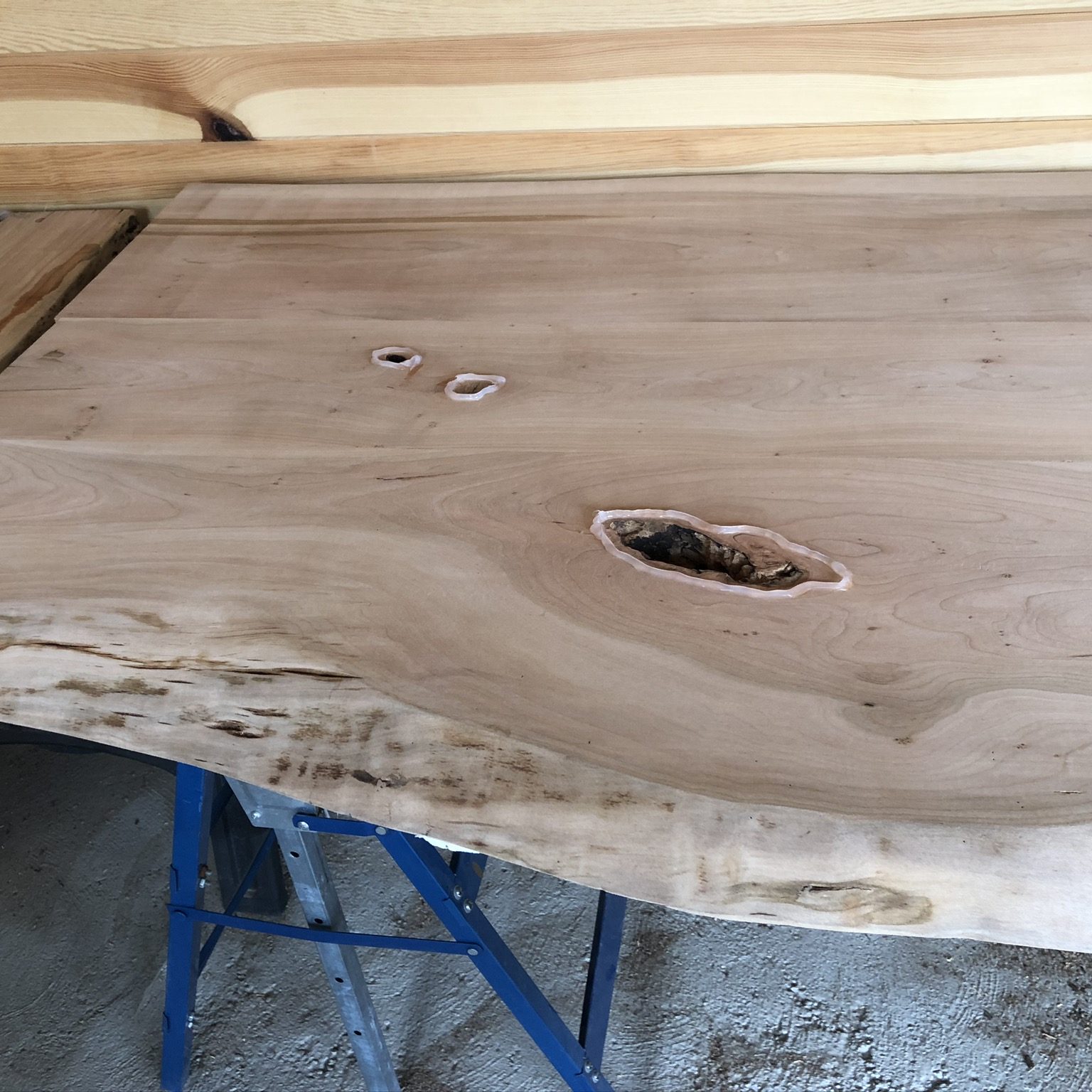 3 Kirchbohlen bilden diesen Tisch aus einem Mittelstück beidseitig