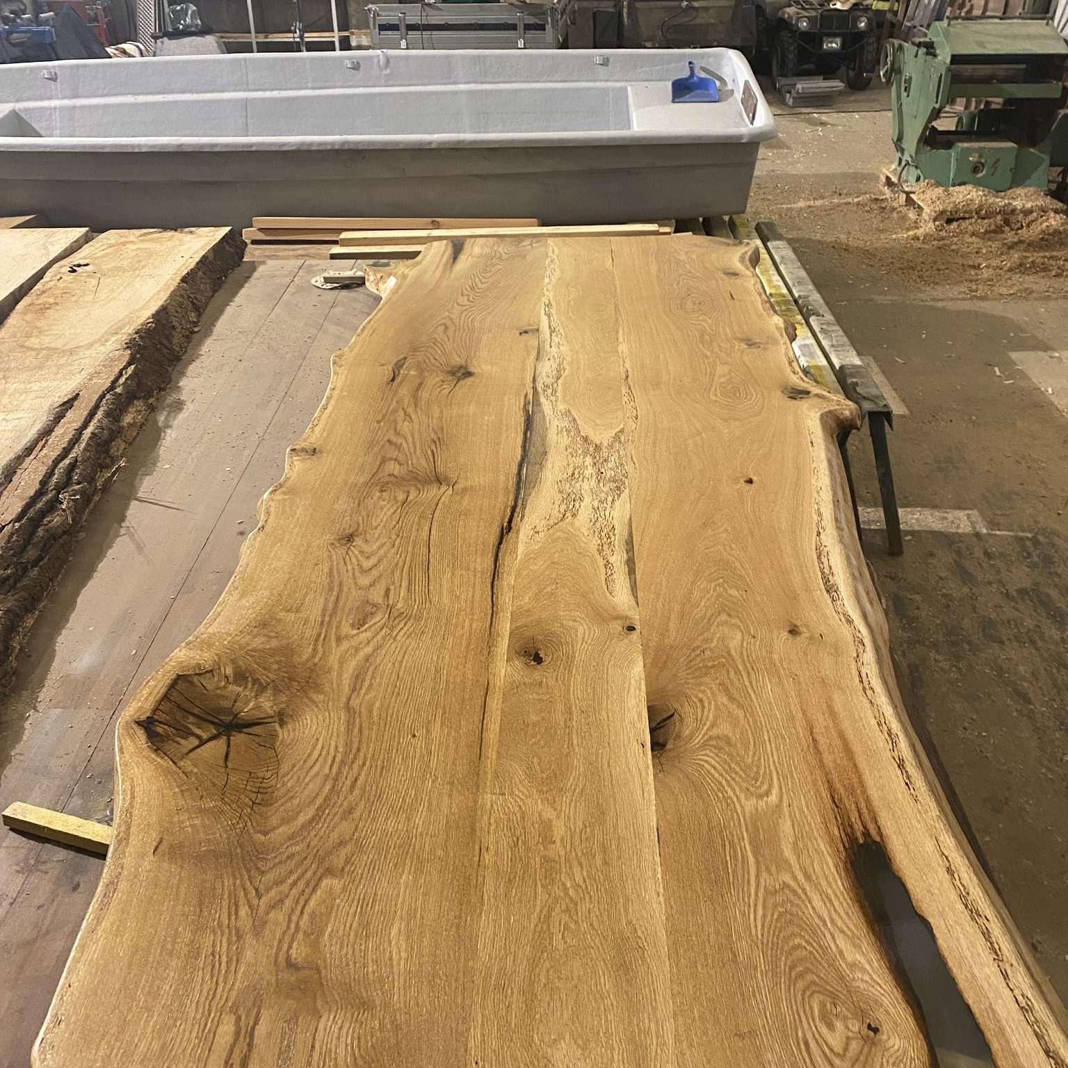 Tisch aus 3 großen Bohlen und einem Mittelstück.